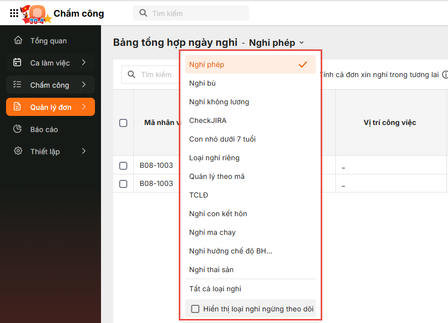 Lưu ý: Khi chọn Hiển thị loại nghỉ ngừng theo dõi, các loại nghỉ đã ngừng nhưng trong kỳ có phát sinh vẫn sẽ được liệt kê