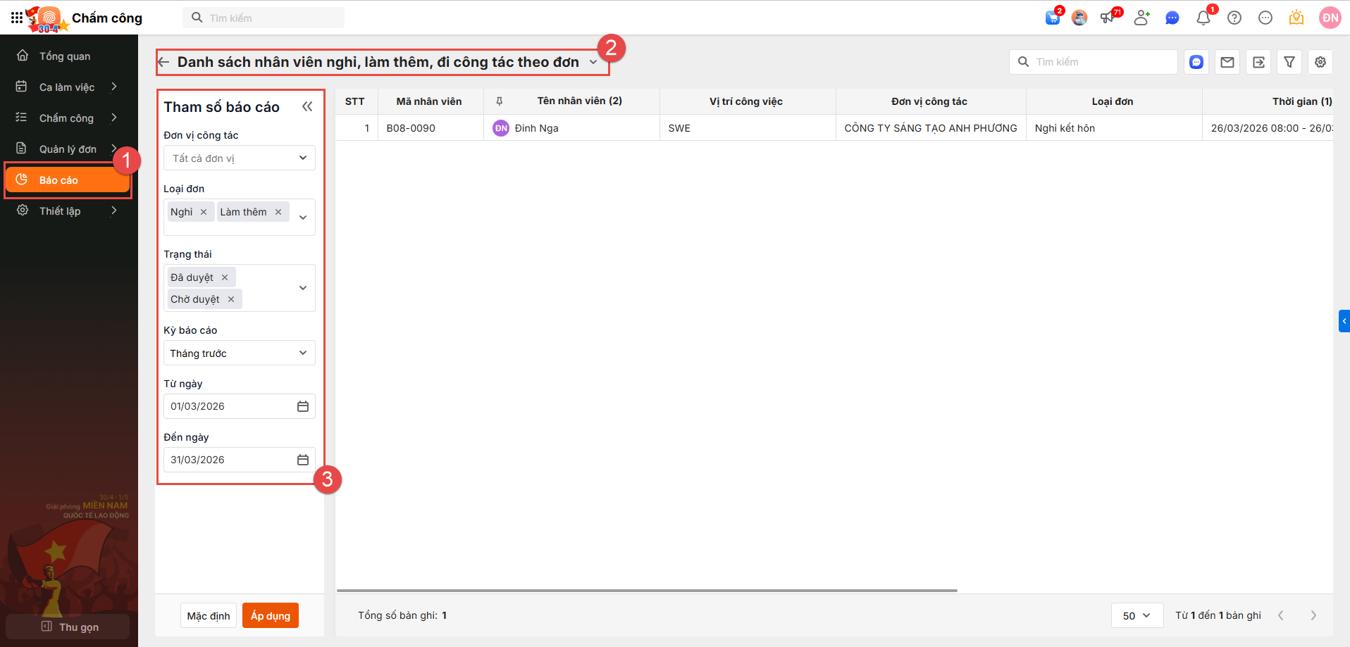 Vào phân hệ Báo cáo \chọn báo cáo Danh sách nhân viên nghỉ, làm thêm, đi công tác theo đơn.