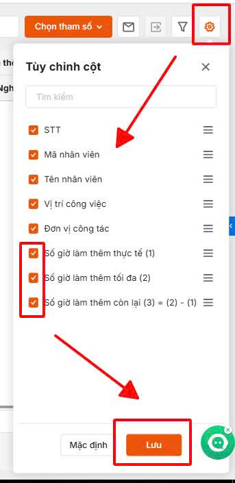 Vào phân hệ báo cáo \ Tổng hợp tình hình làm thêm của nhân viên \ Nhấn icon Bánh răng ⚙ ở góc phải màn hình \ Tích chọn☑ cột Số giờ làm thêm tối đa & Số giờ làm thêm còn lại \ nhấn Lưu.