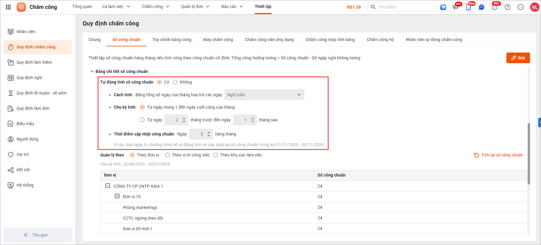 Sau khi thiết lập hoàn tất, đến thời điểm thiết lập tự động cập nhật hoặc khi cập nhật tay thì chương trình sẽ tự động tính lại số công chuẩn của tháng theo chu kỳ đã thiết lập.
