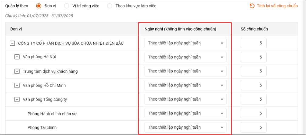 Ví dụ: Khối kinh doanh tính công chuẩn bằng cách trừ ngày nghỉ tuần còn Khối sản xuất lại tính công chuẩn bằng cách trừ các ngày chủ nhật.