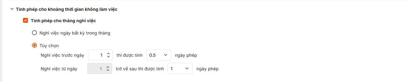 Vào phân hệ Thiết lập \ Quy định nghỉ \ Chung \ Di chuyển xuống dòng Tính phép cho tháng nghỉ việc