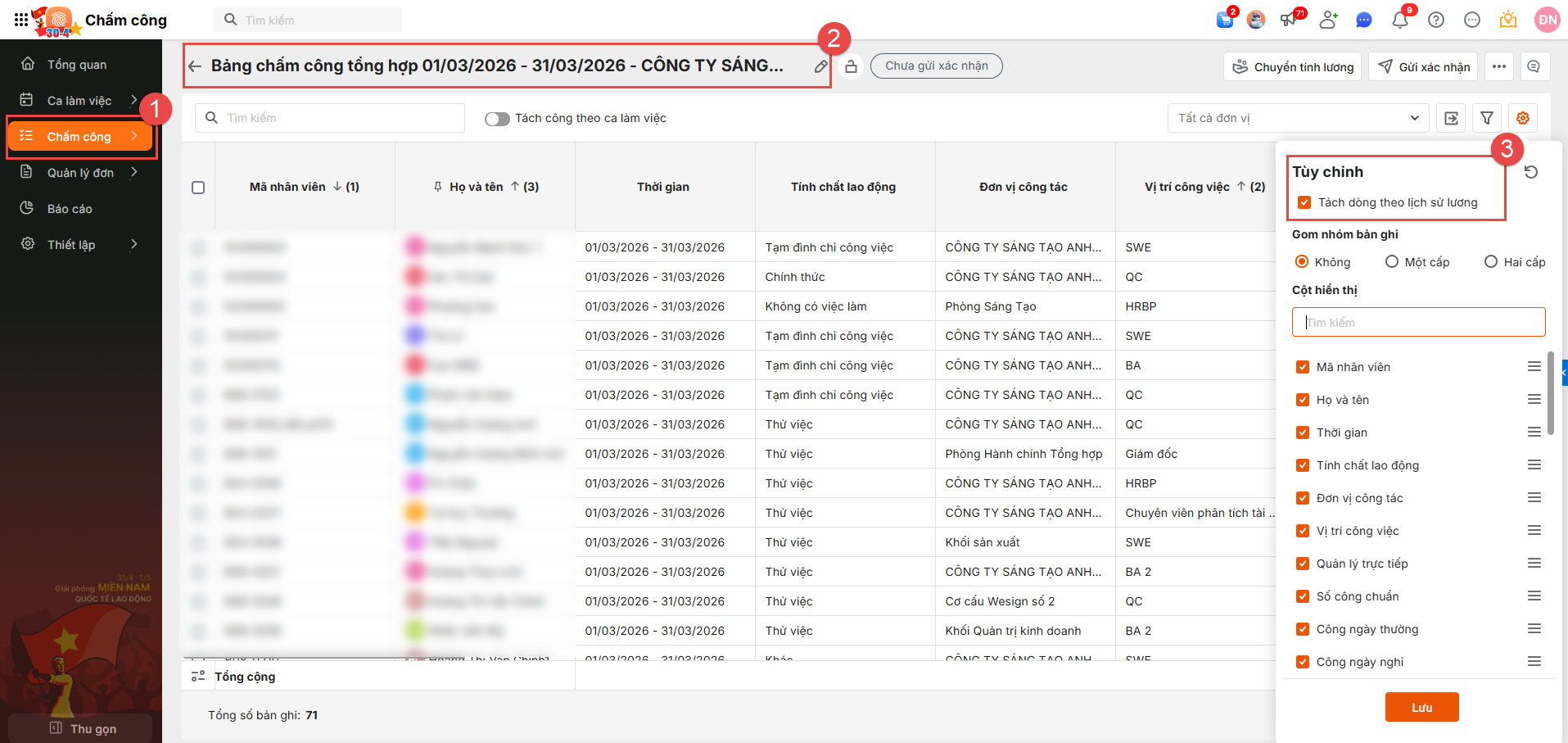- Hướng dẫn tùy chỉnh chức năng Tách dòng theo lịch sử lương trên Bảng chấm công tổng hợp.