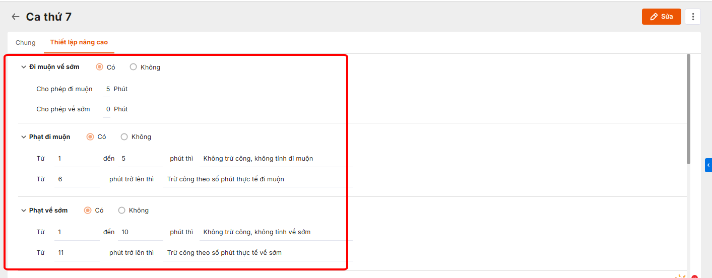 - Truy cập mục Thiết lập nâng cao \ Nhấn biểu tượng cây bút (Sửa) để sửa ca.