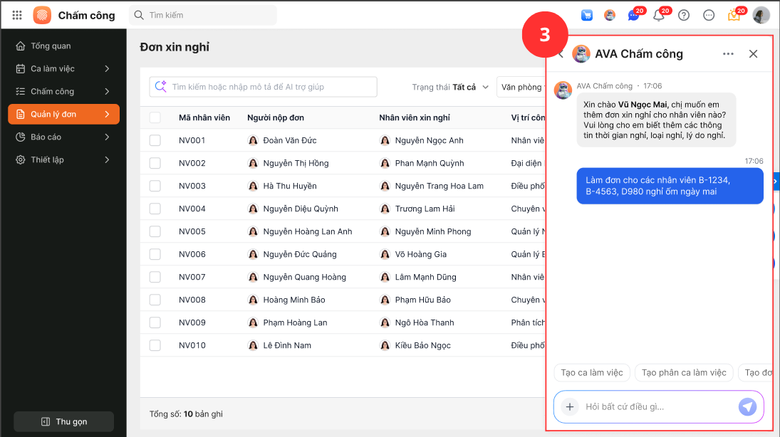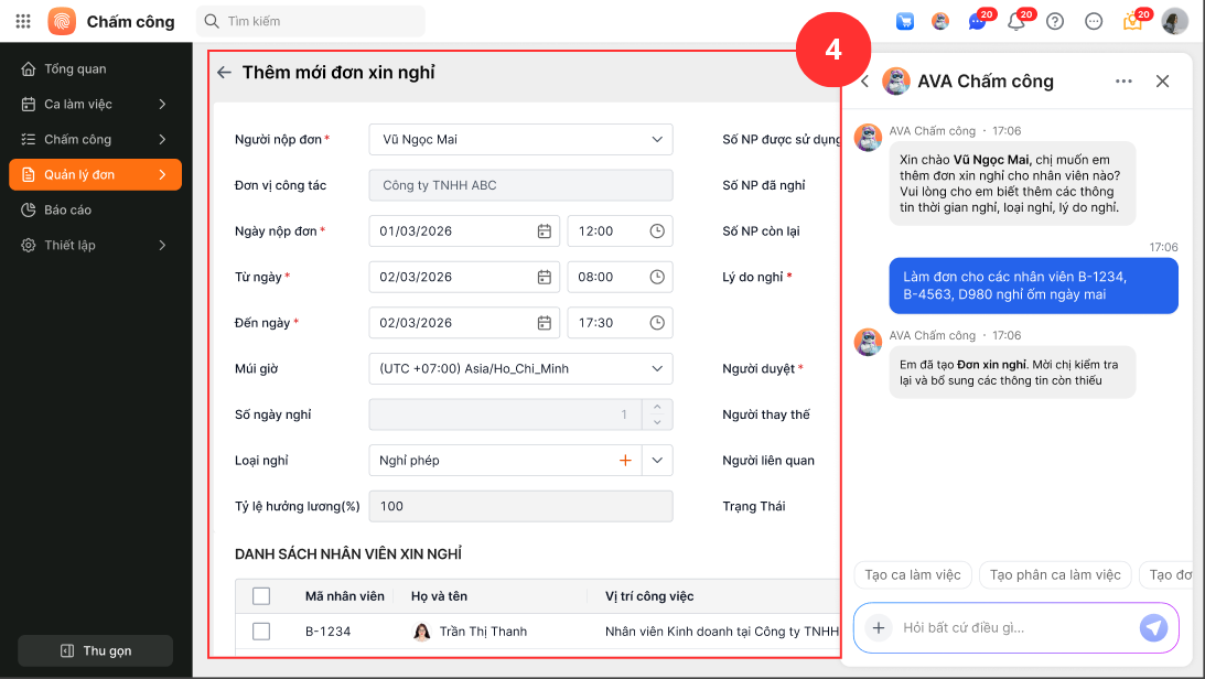 Ví dụ: Khi HR/quản lý muốn làm đơn xin nghỉ hộ cho nhân viên, thay vì phải thao tác thủ công làm đơn xin nghỉ thì trên AMIS Chấm công hỗ trợ nhắn trực tiếp với AVA Chấm công và sẽ tự động làm đơn xin nghỉ theo yêu cầu.