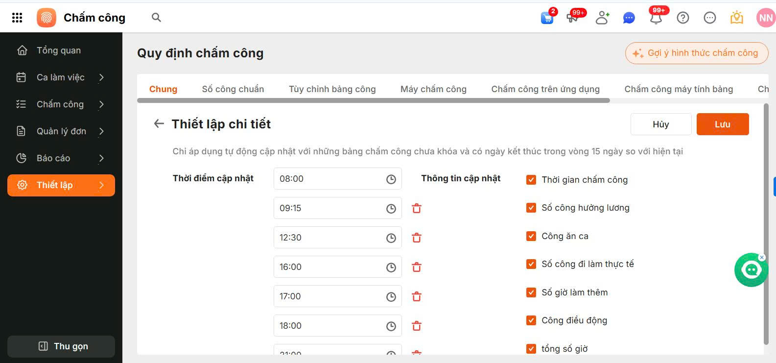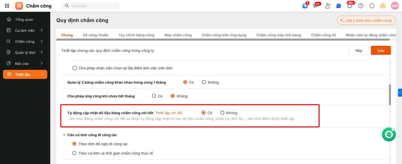 Bước 3: Di chuyển chuột đến dòng Tự động cập nhật dữ liệu bảng chấm công chi tiết \ Tích chọn Có \ nhấn Thiết lập chi tiết để thiết lập Thời điểm cập nhật và các thông tin cần cập nhật.