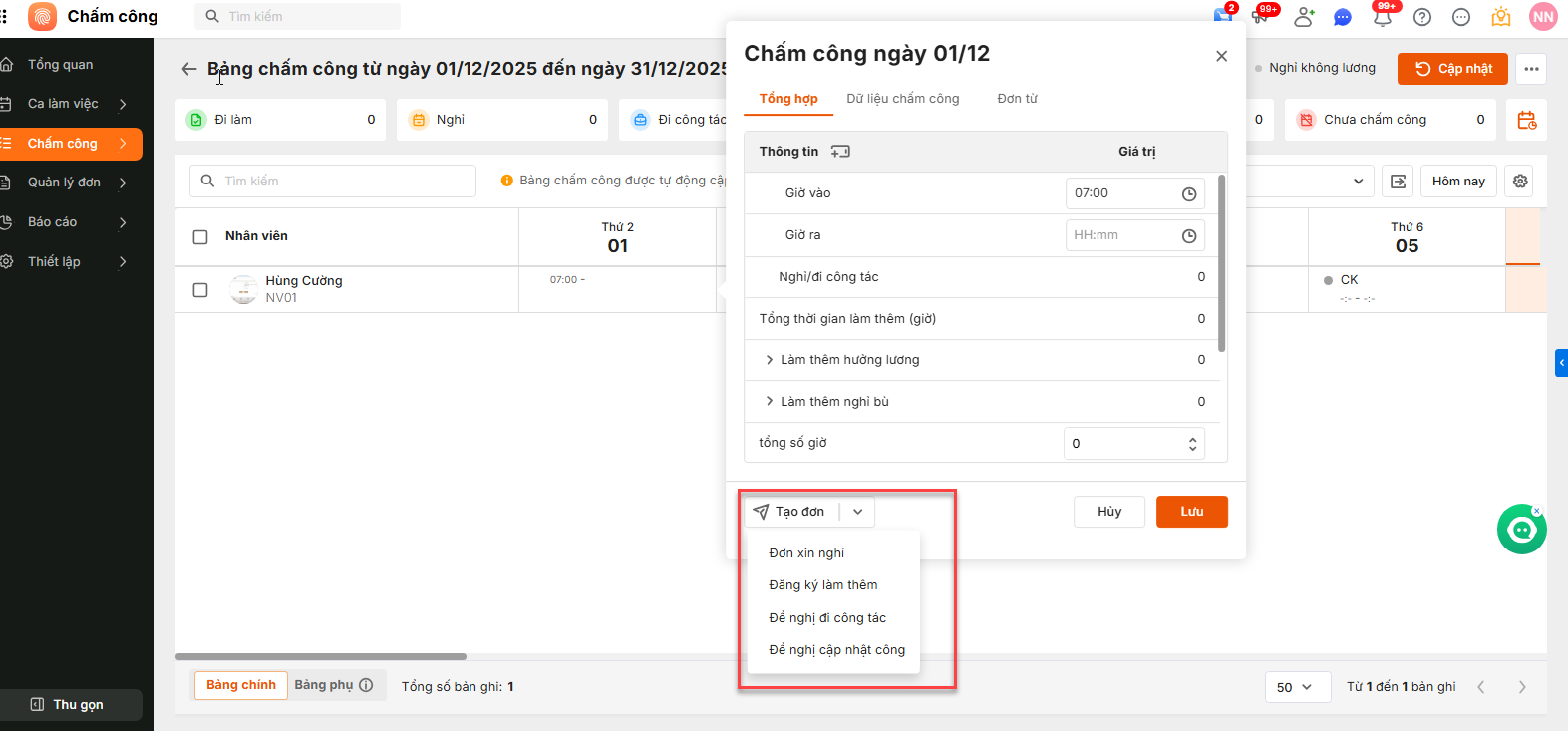 2.2 Tạo nhanh Đơn từ cho Nhân viên tại Bảng chấm công chi tiết