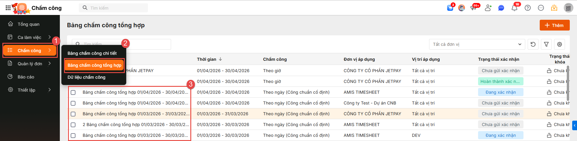 Trên AMIS Chấm công, vào phân hệ Chấm công\chọn Bảng chấm công hợp\Xem chi tiết Bảng chấm công tổng hợp