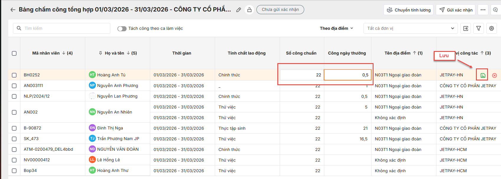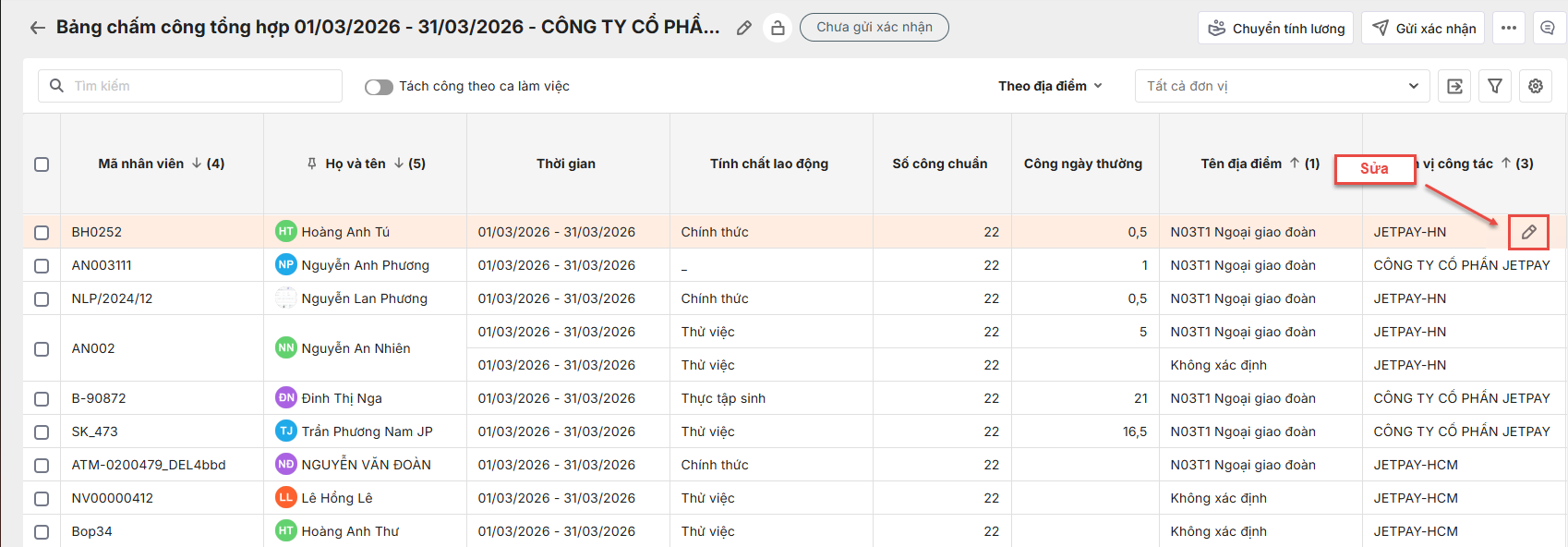 Hướng dẫn chỉnh sửa trực tiếp số công trên Bảng chấm công tổng hợp