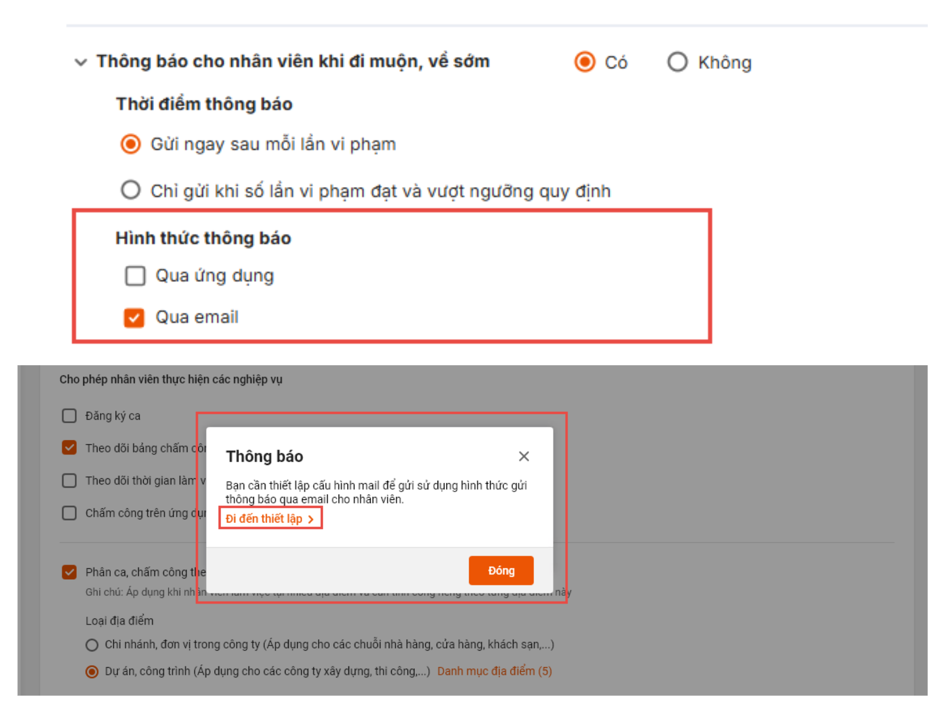 - Hướng dẫn chi tiết các bước thiết lập gửi thông báo cho nhân viên khi đi muộn về sớm qua email