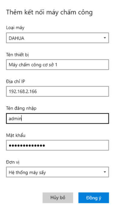 Nhập các thông tin đã lấy từ bước 1\nhấn Đồng ý để thêm kết nối máy chấm công.