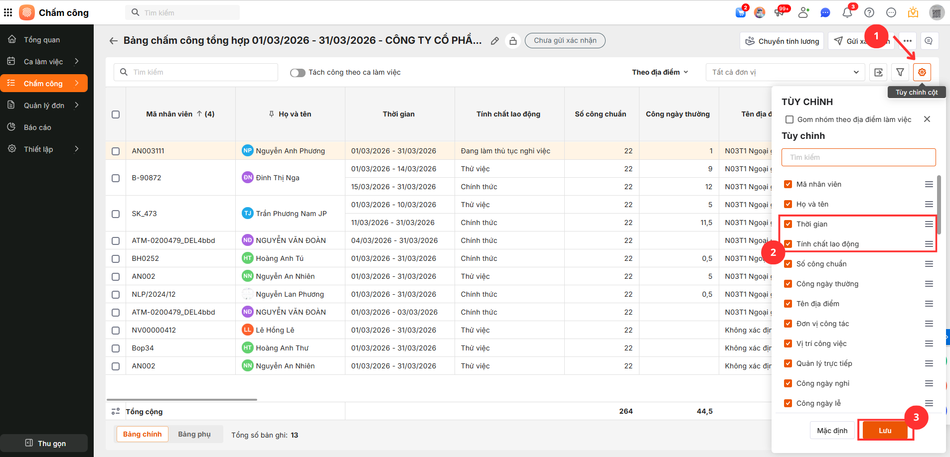Trên giao diện chi tiết Bảng chấm công tổng hợp, di chuột đến ô Tùy chỉnh cột \ tích chọn ô Thời gian và ô Tính chất lao động \ nhấn Lưu.