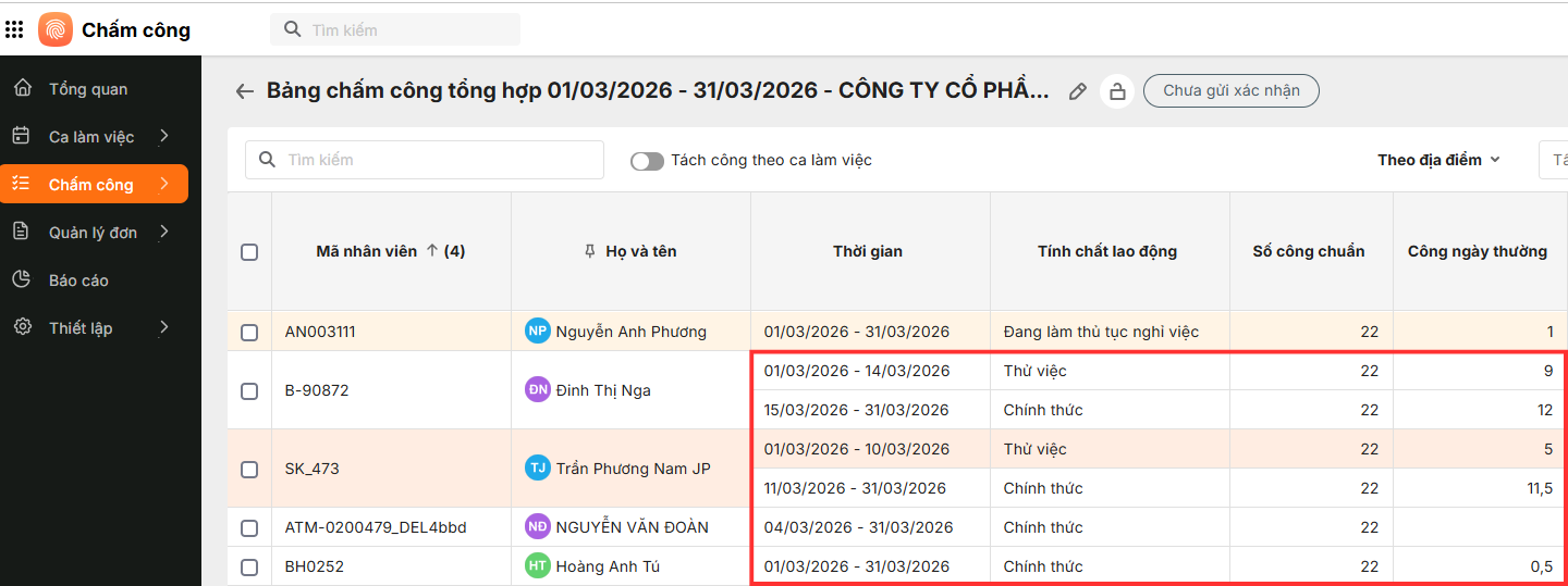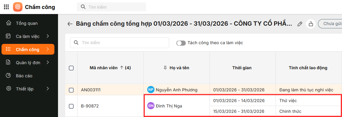 Ví dụ: Nhân viên Đinh Thị Nga có thời gian thử việc 01/03/2026 – 14/03/2026, được lên chính thức và tăng lương vào 15/03/2026, trên Bảng chấm công tổng hợp sẽ tự động chia tách 2 mốc thời tương ứng với sự thay đổi lịch sử lương.
