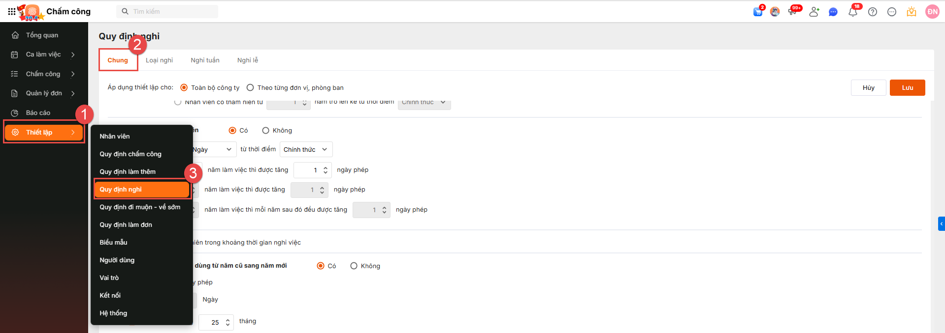 Bước 1: Trên AMIS Chấm công, tại phân hệ Thiết lâp\ chọn Quy định nghỉ\ chọn Chung để thiết lập tổng thể