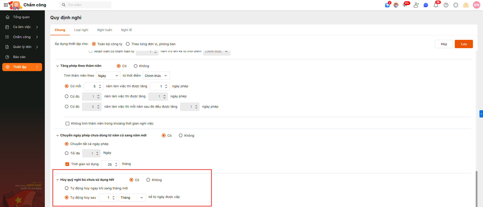 Bước 2: Tại mục “Hủy quỹ nghỉ bù chưa sử dụng hết”\ chọn Tự động hủy sau\Nhập số thời gian và lựa chọn đơn vị áp dụng Ngày hoặc Tháng.