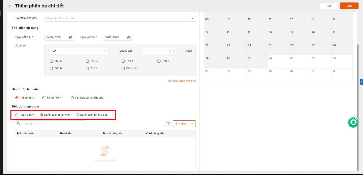 3.4 Làm theo ca kíp đổi định kỳViệc khai báo các bảng phân ca tương ứng với từng ca làm việc theo quy định tại đơn vị. Ví dụ: Ca sáng, Ca chiều, Ca tối,… Nếu ca được áp dụng cho từng nhân viên thì lựa chọn đối tượng áp dụng là Nhân viên và chọn nhân viên được phân ca tương ứng, nếu ca được áp dụng cho cả 1 bộ phận (ví dụ: tổ, đội, nhóm) thì chọn danh sách phòng ban, nếu ca được áp dụng cho tất cả nhân viên toàn công ty thì chọn là toàn đơn vị.