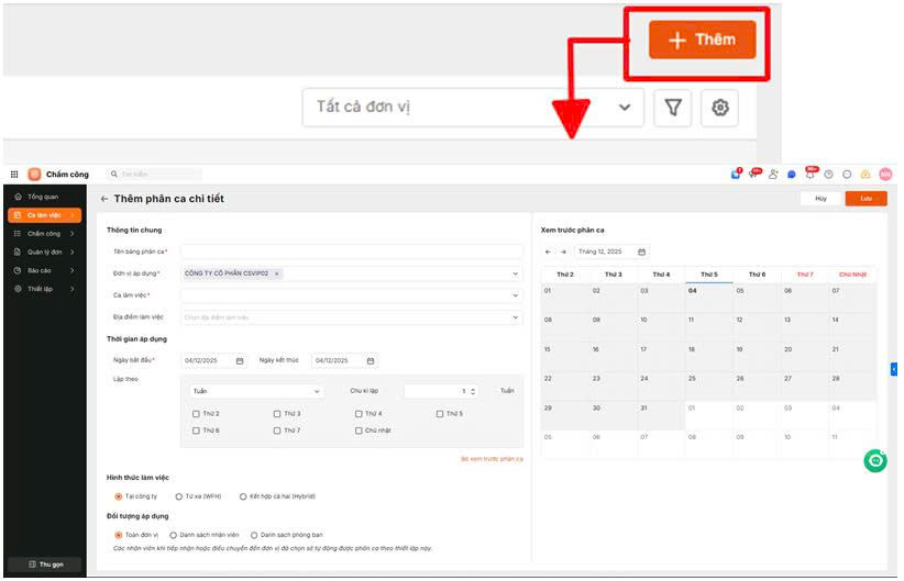 2.2 Khai báo bảng phân ca chi tiếtAnh/Chị nhấn Thêm để khai báo bảng phân ca chi tiết mới theo quy định của đơn vị với các thông tin: