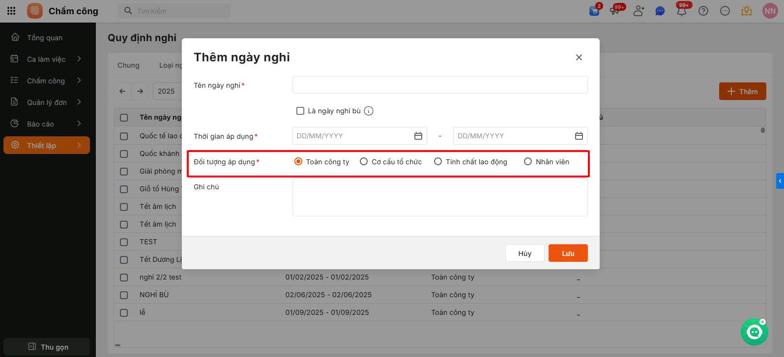 - Tích chọn đối tượng áp dụng là Toàn công ty, Cơ cấu tổ chức, Tính chất lao động hoặc Nhân viên nhất định.