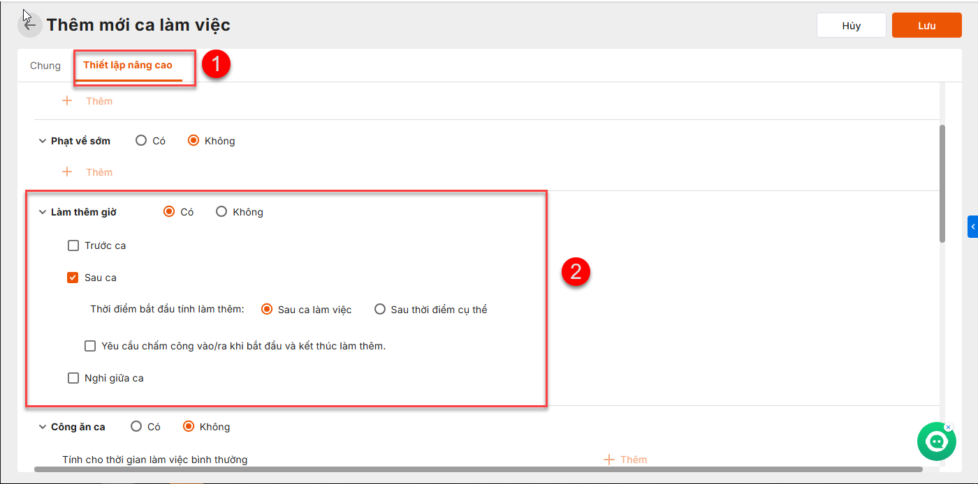 Ngoài ra, cần thiết lập các khung giờ làm thêm (VD: 16:00 – 22:00, 22:00 – 00:00) để chương trình tính toán chính xác số giờ làm thêm cho nhân viên theo từng khung giờ. Bước 2: Thiết lập ca làm việc được tính làm thêm giờ