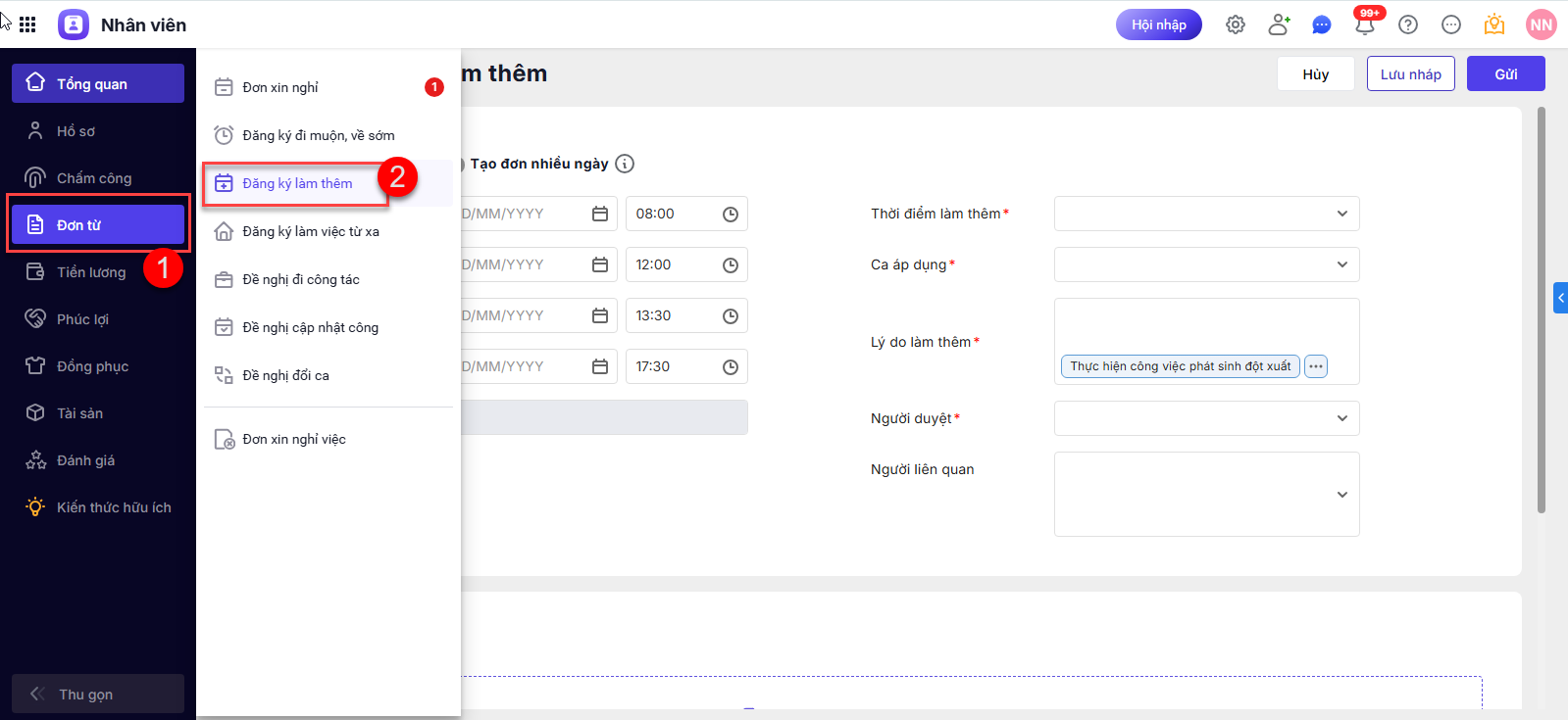 Bước 3: Nhân viên lập/duyệt đơn đăng ký làm thêmNhân viên có thể lập/duyệt đơn đăng ký làm thêm trên ứng dụng MISA AMIS (phiên bản Mobile) hoặc AMIS Nhân viên (phiên bản Web).
