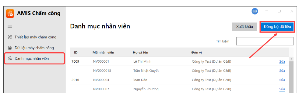Mở Tool AMIS Chấm công tại mục Danh mục nhân viên, bấm đồng bộ, đảm bảo Nhân viên đã hiển thị đầy đủ mã ID và mã Nhân viên.