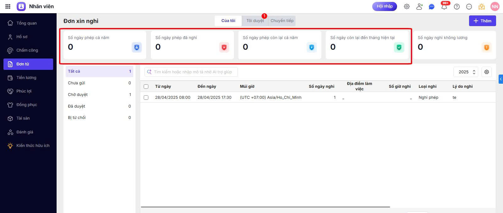 Do đó, nếu nhân viên lập đơn xin nghỉ phép mà phần mềm hiển thị các thông tin về ngày phép bằng 0, khiến cho nhân viên không lập được đơn thì Anh/Chị cần kiểm tra lại các điều kiện sau:
