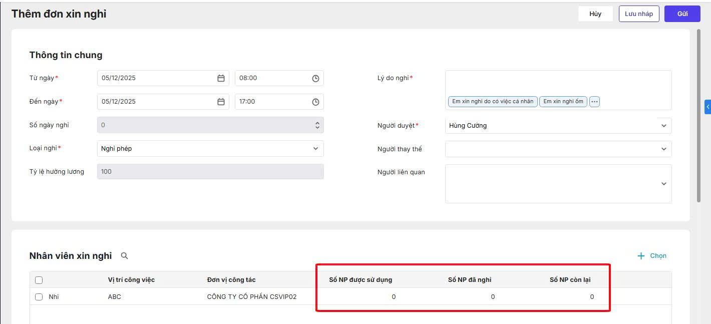 [Quản lý đơn] Vì sao nhân viên không lập được đơn xin nghỉ phép (phần mềm hiển thị số ngày phép bằng 0)?