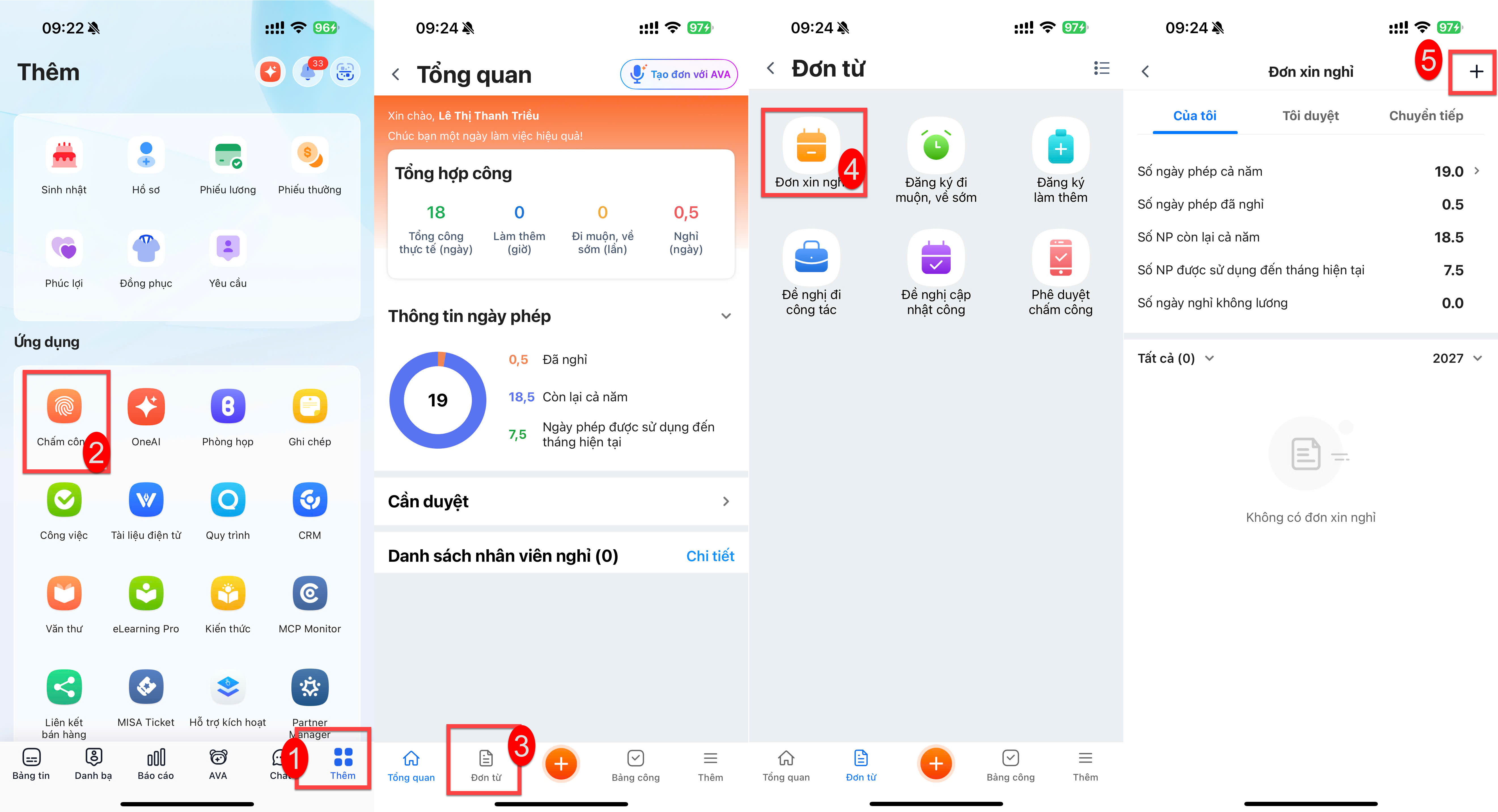 | 2 | Đăng ký đi muộn, về sớm | Sử dụng khi nhân viên phát sinh việc bận không thể đến/về đúng giờ quy định hoặc nhân viên nữ đang trong thời gian nuôi con dưới 12 tháng tuổi được hưởng chế độ nghỉ mỗi ngày 60 phút theo Luật | |