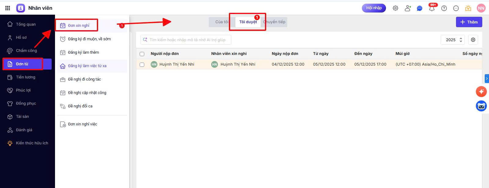 Chương trình sẽ ghi nhận ý kiến này vào đơn và gửi thông báo cho người được chọn phê duyệt để tiện nắm được thông tin. 2.2 Trên WebsiteAnh/Chị quản lý truy cập vào AMIS Nhân viên, chọn phân hệ Đơn từ \Đơn xin nghỉ\Tôi duyệt. Tại đây, chương trình hiển thị danh sách tất cả các đơn mà anh chị được chọn là người duyệt. Lưu ý: Kiểm tra năm thực hiện trên Giao diện AMIS Nhân viên có trùng khớp với thời gian xin nghỉ\công tác\làm thêm … trên đơn.