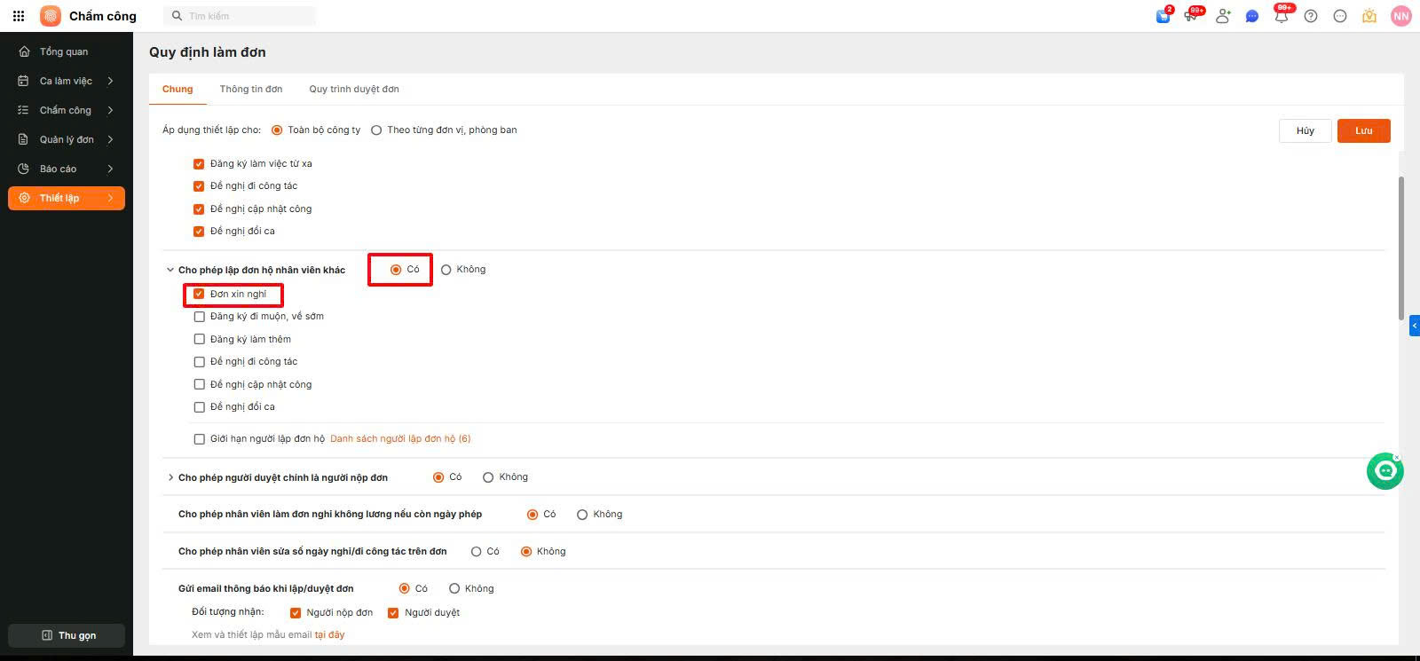 Vào phân hệ Thiết lập \ Quy định làm đơn \ Chung và chọn bật thiết lập Cho phép lập đơn hộ nhân viên khác \ Tích chọn Đơn xin nghỉ \ nhấn Lưu.