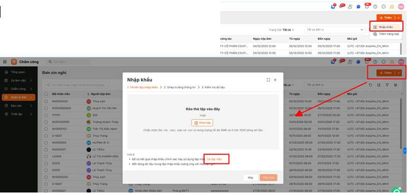 Trường hợp 2: Quản lý sử dụng tính năng Nhập khẩu đơn trên ứng dụng AMIS Chấm công thì cần khai báo đầy đủ cột Danh sách nhân viên xin nghỉ để chương trình ghi nhận dữ liệu.