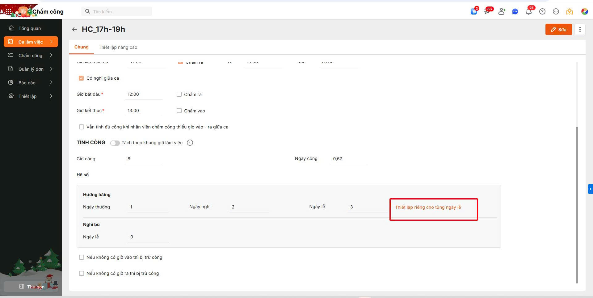 Bước 2: Bấm Sửa \ Chọn mục “Thiết lập riêng cho từng ngày lễ“.