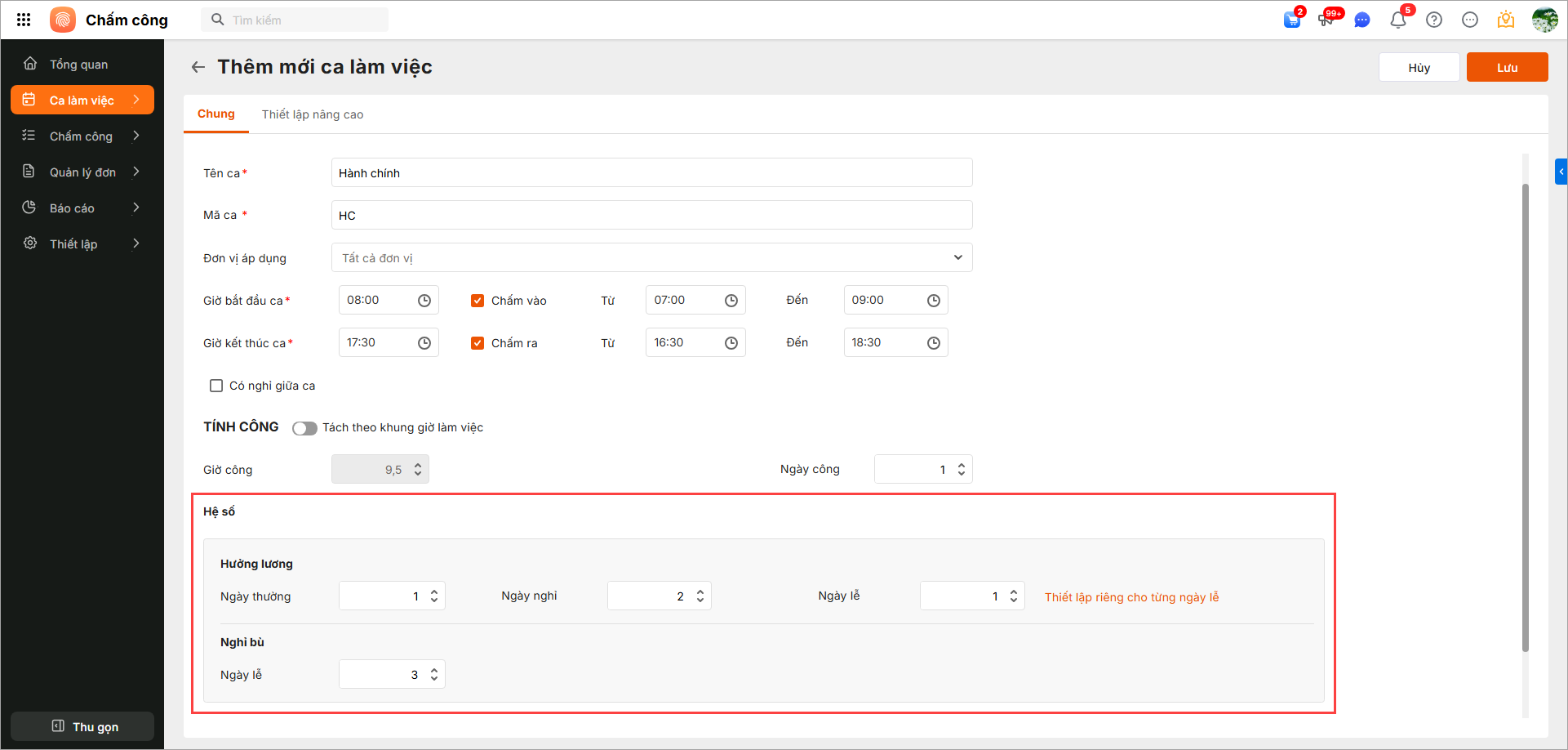 Tại danh mục ca làm việc, khi khai báo hệ số của ca giao diện chia thành 2 mục Hưởng lương và Nghỉ bù. Lưu ý: mục Nghỉ bù chỉ cho phép khai báo hệ số của ngày lễ.