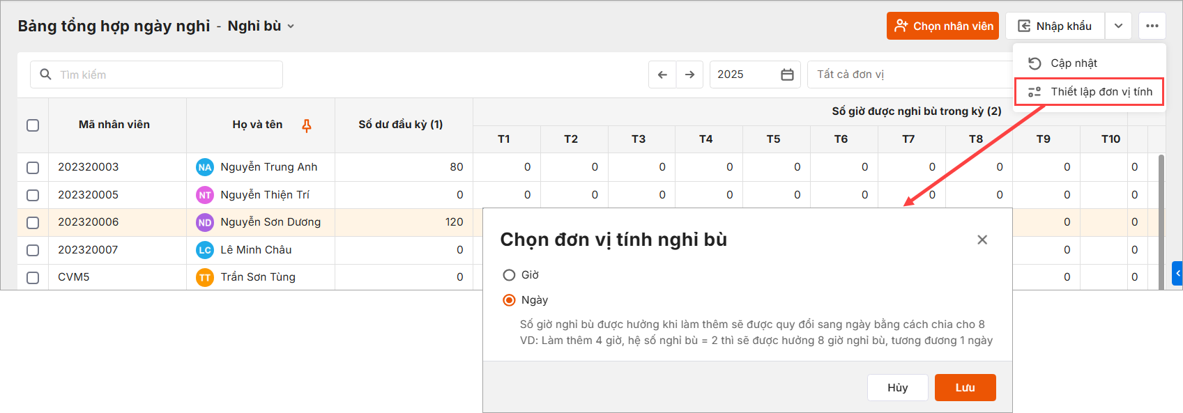 - Cho phép tùy chỉnh đơn vị tính nghỉ bù là theo giờ hoặc theo ngày