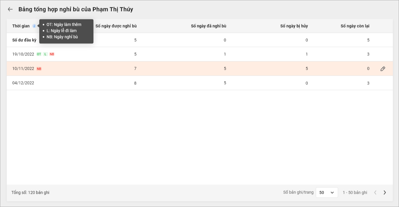 – Số ngày còn lại: = Số ngày được nghỉ bù – Số ngày đã nghỉ bù – Số ngày bị hủy