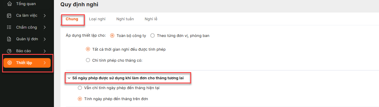 Bước 2: Tại mục Số ngày phép được sử dụng khi làm đơn cho tháng tương lai, phần mềm hỗ trợ 2 thiết lập như sau: