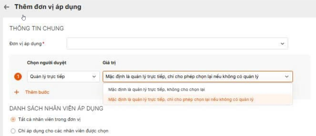 • Lựa chọn các hình thức phê duyệt: mặc định là quản lý trực tiếp, cho phép chọn lại hoặc nhân viên tự chọn