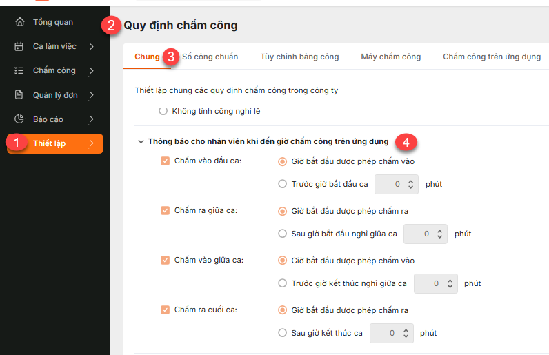 2. Các bước thiết lập thời điểm gửi thông báo chấm công