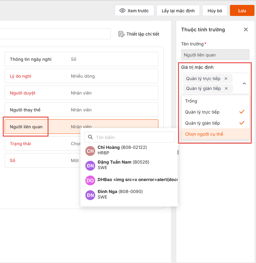 Bước 2: Tại giao diện tùy chỉnh thông tin đơn, anh/chị chọn Người liên quan\chọn Giá trị mặc định\Lưu.