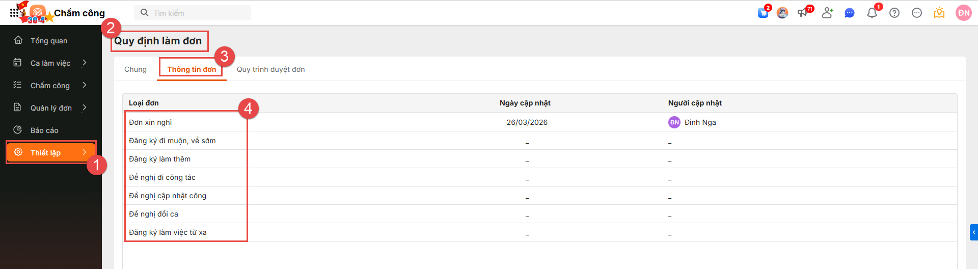 Bước 1: Truy cập Thiết lập \Quy định làm đơn \Thông tin đơn\Chọn loại đơn cần thiết lập (đơn xin nghỉ \đơn đăng ký làm thêm)