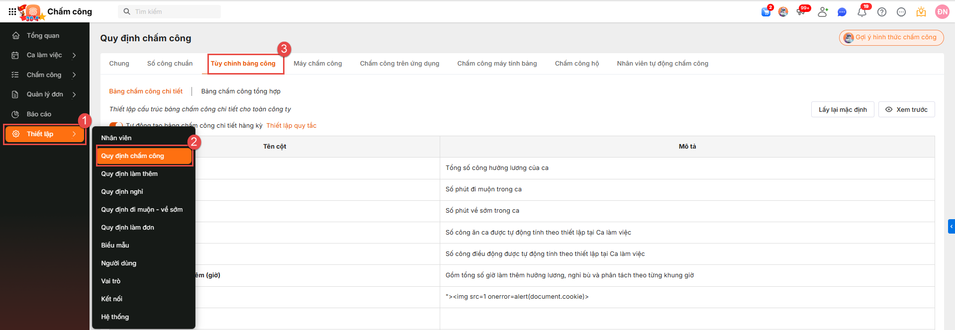 Vào phân hệ Thiết lập\chọn Quy định chấm công\chọn Tùy chỉnh Bảng chấm công