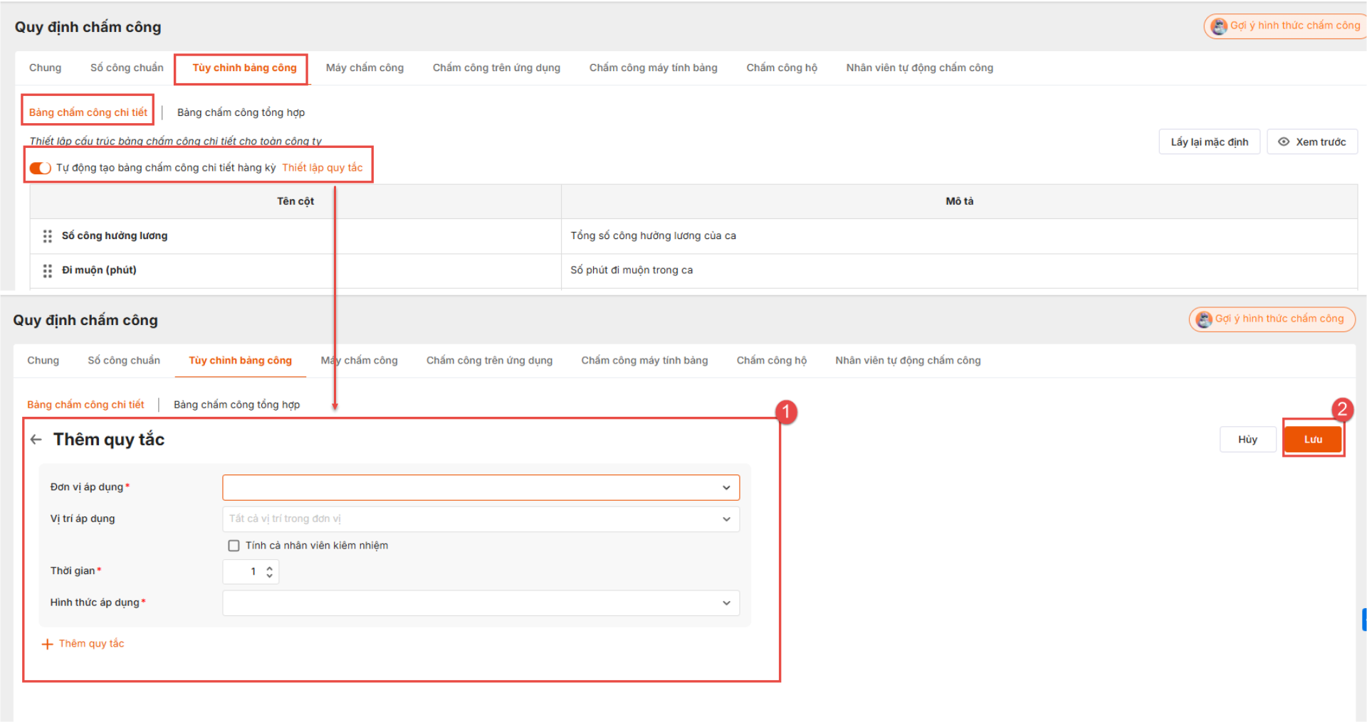 Khi muốn thiết lập tự động tạo bảng chấm công chi tiết, tại mục Bảng chấm công chi tiết\ tích chọn Tự động tạo bảng chấm công chi tiết\chọn Thiết lập quy tắc