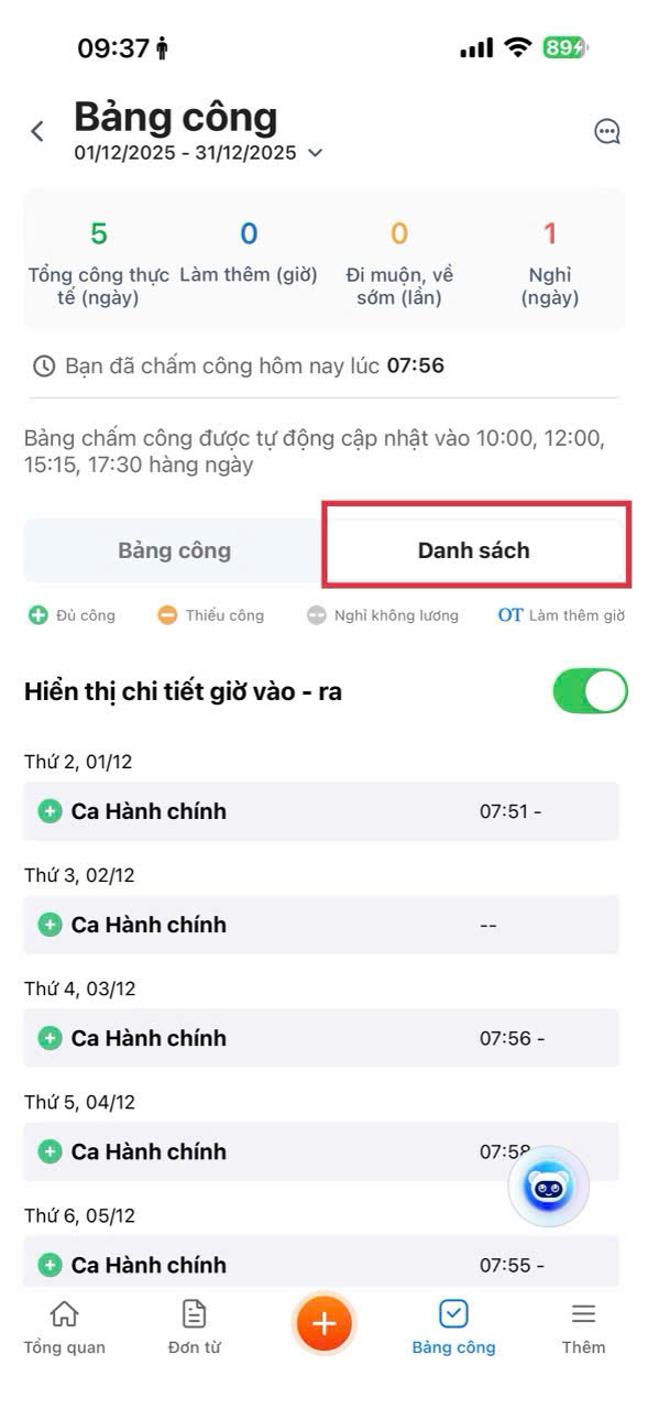 Tra cứu lịch sử chấm công cả tháng trên ứng dụng MISA AMIS mobile Nội dung 1. Tổng quan2. Hướng dẫn chi tiết 1. Tổng quan Bài viết nhằm hướng dẫn: Hướng dẫn người dùng xem lịch sử chấm công trên ứng dụng AMIS Chấm công. Nội dung tổng quan bao gồm: Hướng dẫn truy cập mục Lịch sử chấm công Phạm vi áp dụng: Nhân viên, Nhân sự, Quản lý trực tiếp 2. Hướng dẫn chi tiết Bước 1: Mở ứng dụng MISA AMIS trên điện thoại Bước 2: Chọn Thêm \ Chấm công. Bước 3: Trên giao diện chấm công, nhấn vào biểu tượng 🗹 Bảng công ở phía cuối màn hình \ chọn Danh sách để xem lịch sử chấm công Bài viết này hữu ích với bạn không? Hữu ích Không hữu ích Chúng tôi rất vui khi biết bài viết này giúp ích cho bạn. Hủy bỏ Gửi phản hồi Vui lòng chọn lý do "Không hữu ích" Tôi cảm thấy nội dung còn thiếu và không cụ thể Nên có ví dụ hoặc giải thích rõ ràng hơn về chủ đề Bài viết chưa đáp ứng được câu hỏi của tôi, tôi cần thông tin chi tiết hơn Tôi cần trợ giúp vấn đề khác Hủy bỏ Gửi phản hồi Lượt xem: 427 Cập nhật 06/12/2025 Bài viết này hữu ích chứ? Có Không Nền tảng quản trị doanh nghiệp hợp nhất MISA AMIS với gần 200.000 khách hàng doanh nghiệp đang sử dụng Phần mềm Kế toán Phần mềm Quản lý Nhân sự Phần mềm Quản lý Marketing Phần mềm Quản lý Bán hàng Phần mềm Quản lý Công việc - Dự án Giúp nâng cao hiệu quả hoạt động kinh doanh và mở rộng quy mô Bài viết liên quan Private article