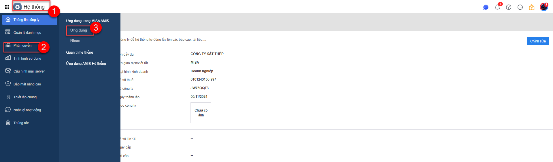 Bước 1: Quản trị hệ thống vào AMIS Hệ thống \ Phân quyền \ Ứng dụng \ Chọn AMIS Nhân viên.