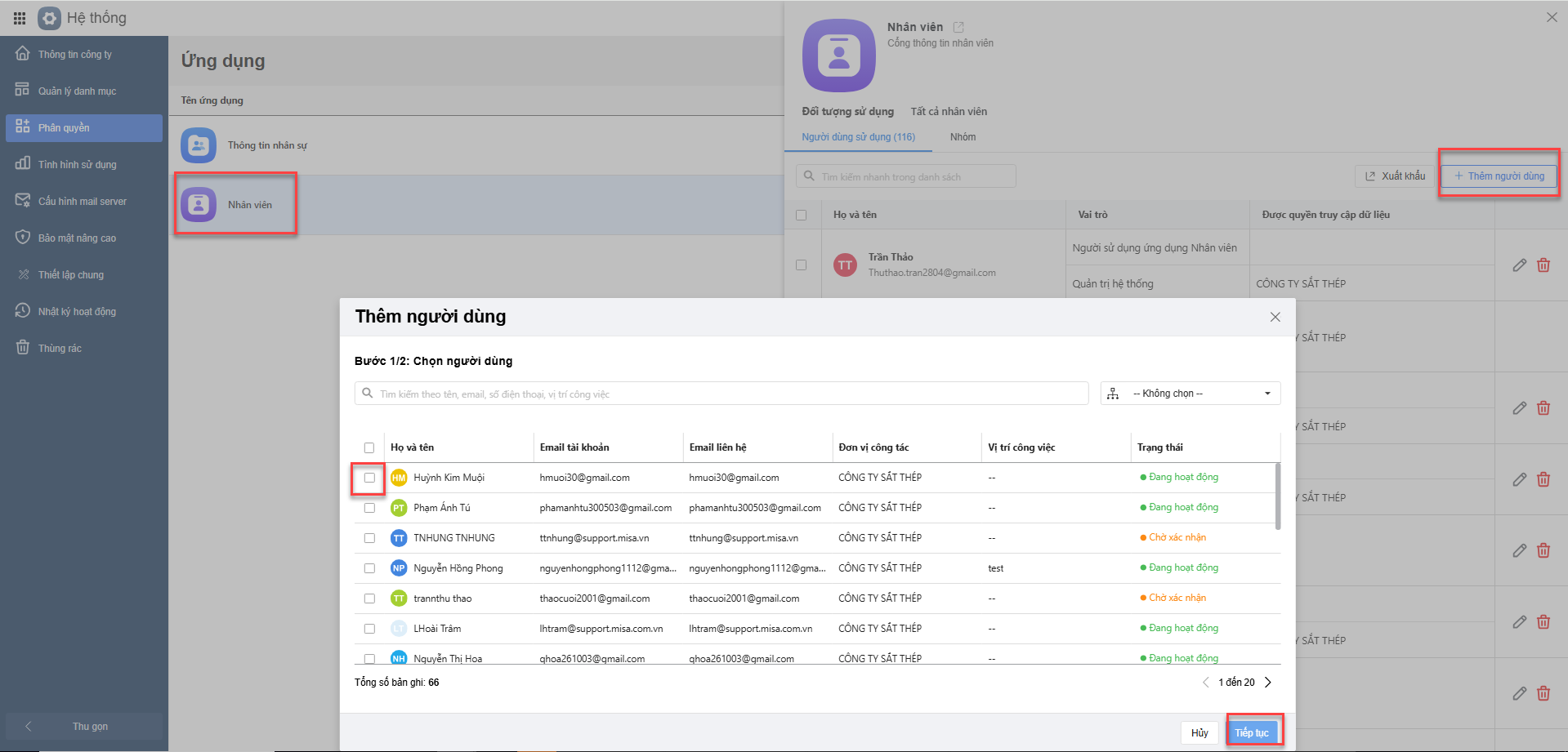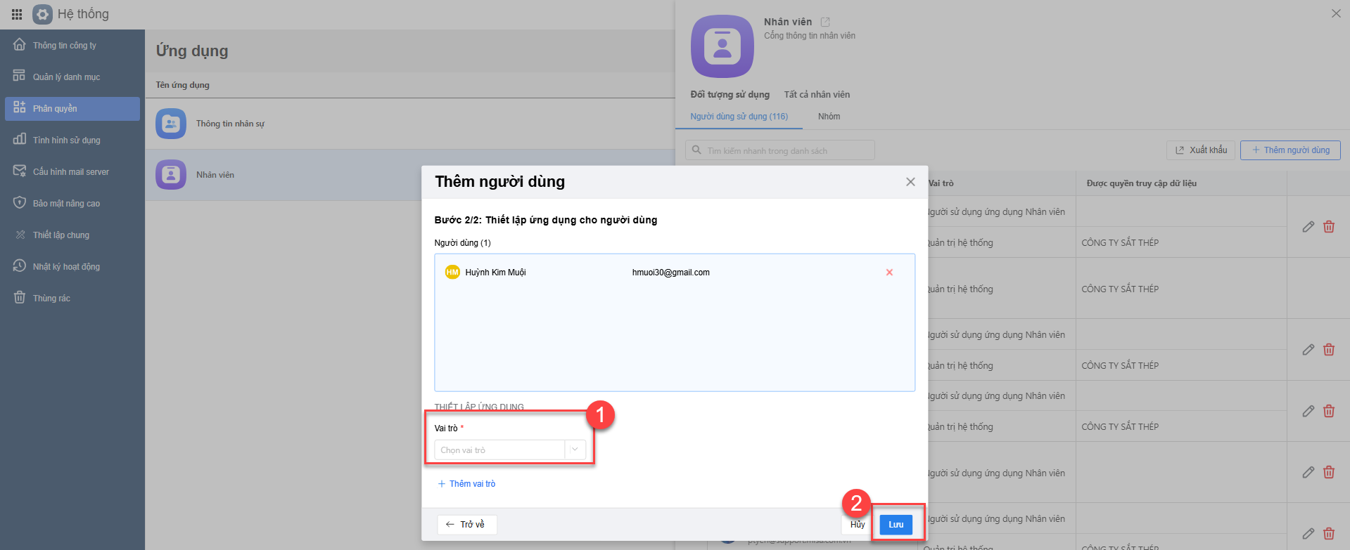 Bước 2: Thêm Người dùng \ Chọn Nhân viên \ Bấm Tiếp tục \ Chọn Vai trò\ Lưu.