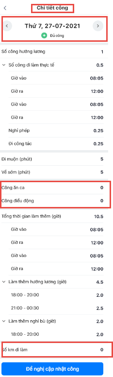 • Các trường như công ăn ca, công điều động, số km đi làm, chỉ hiển thị nếu HR đã bật thiết lập cho ca hoặc bảng công tương ứng..