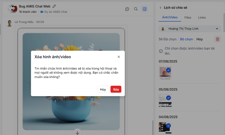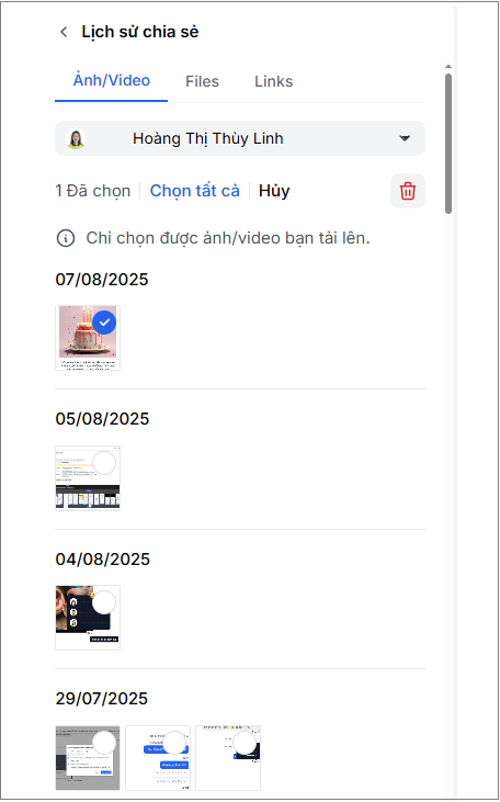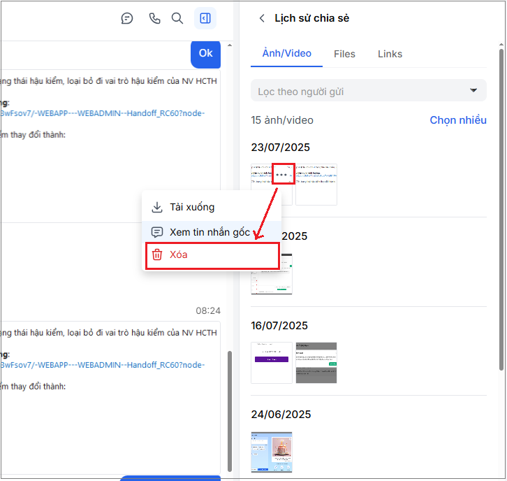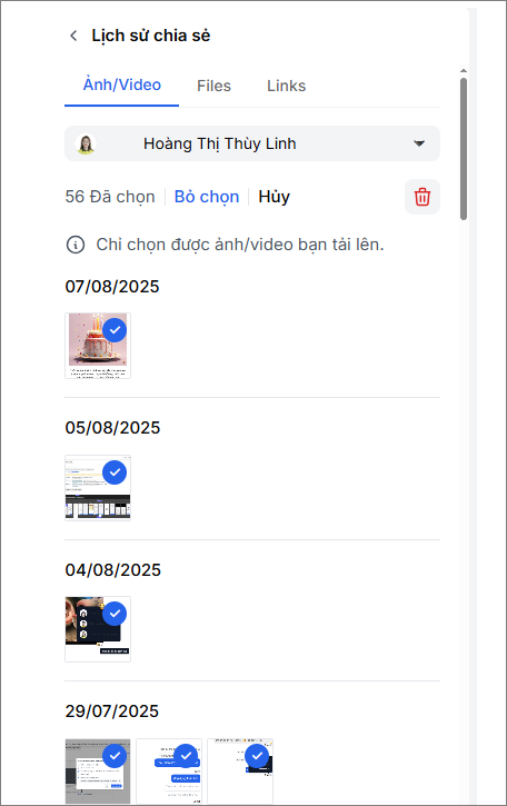 - Bạn chỉ có thể xóa ảnh/video/file do chính bạn gửi lên
