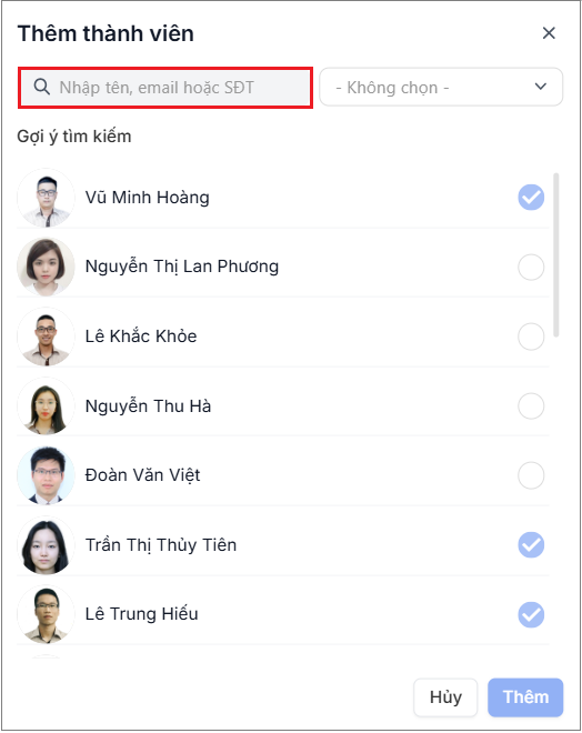 - Trên màn hình Thêm thành viên, bạn có thể thực hiện tìm kiếm thủ công theo tên thành viên hoặc thêm theo CCTC