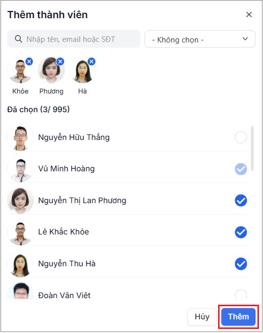 - Tích chọn các thành viên hoặc tìm kiếm chính xác thành viên cần thêm (bạn có thể thêm tối đa 1000 thành viên)