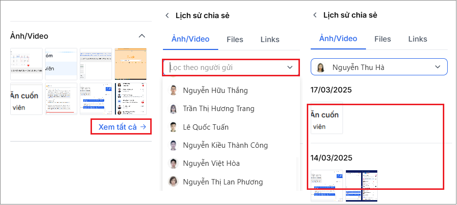 - Tại đây, bạn có thể lọc ảnh/video hoặc file, links theo người gửi.
